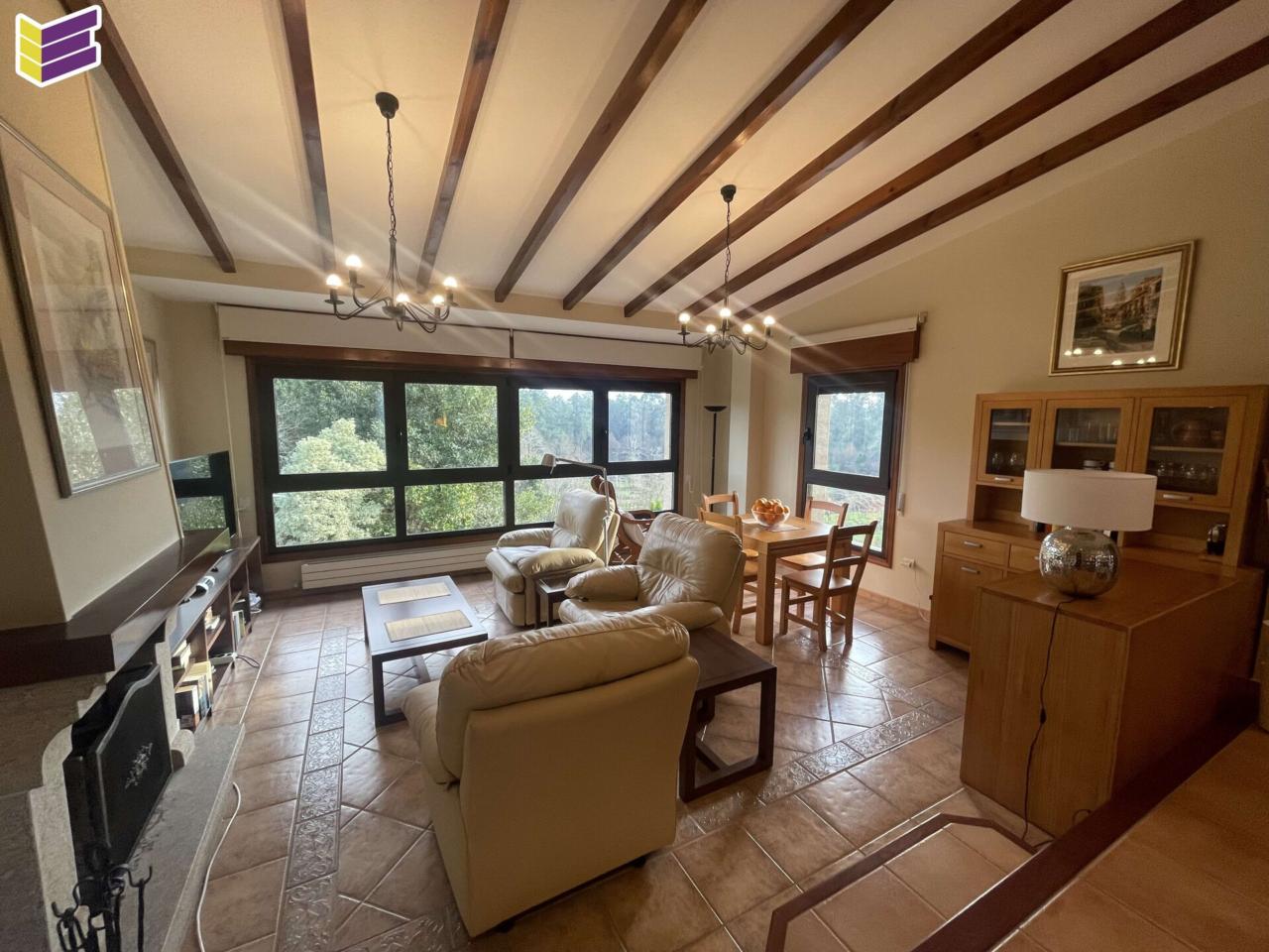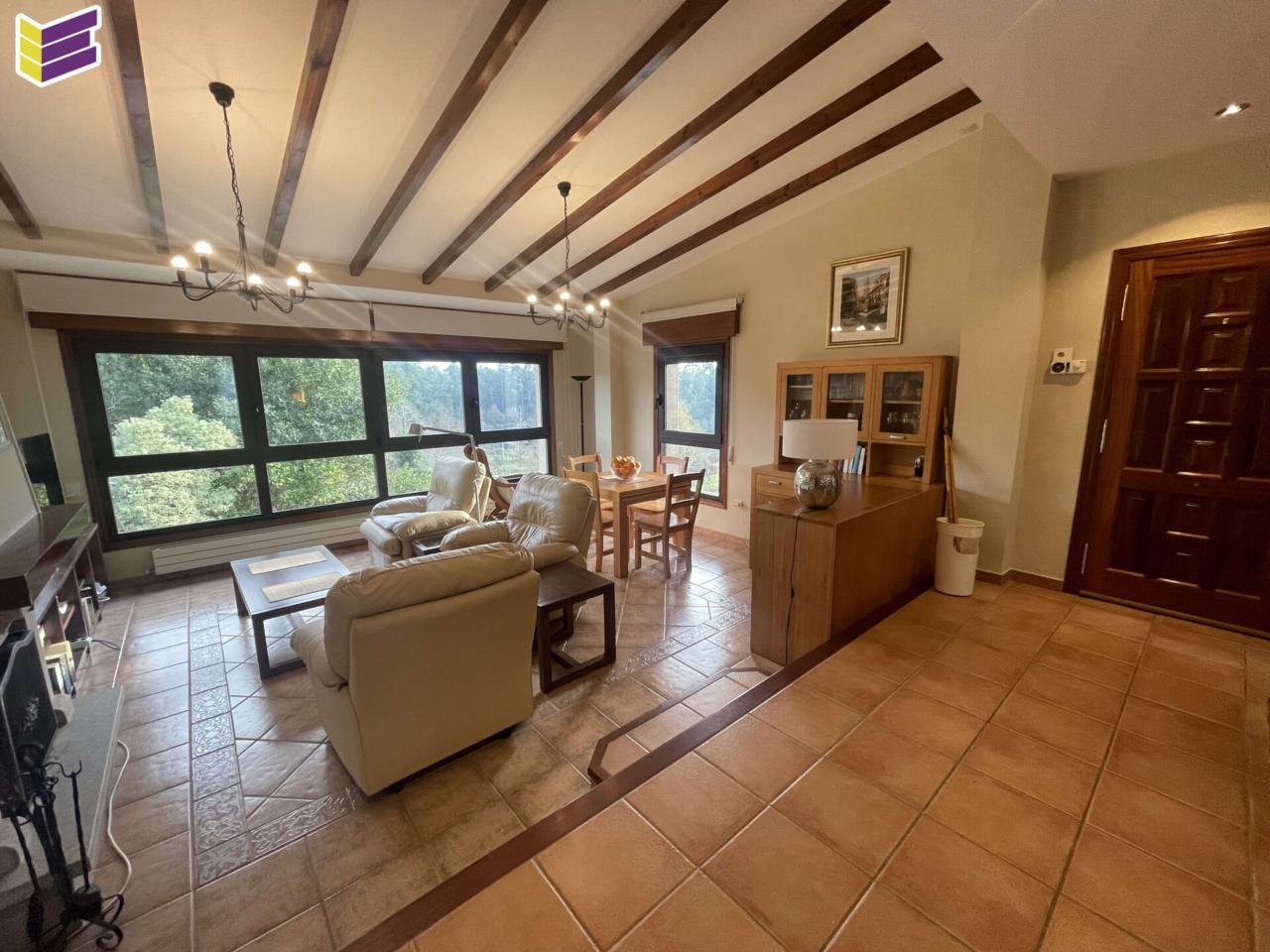 ·Salón comedor de 33m2, muy luminoso a través de ventanal frontal, chimenea de leña, pavimento gres con cenefa, techo inclinado con vigas de madera.