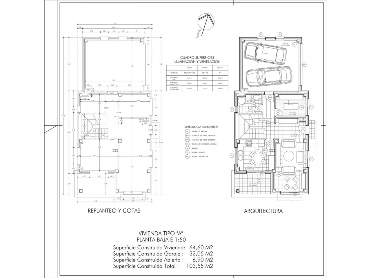 La superficie total construida de esta planta es de 103,55 m², de los cuales 96,65 m² se corresponden con superficie cerrada y 6,90 m² con el porche.